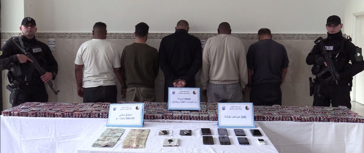 تمكنت فرقة البحث والتدخل لأمن ولاية الجزائر من وضع حد لنشاط شبكة إجرامية منظمة متكونة من (05) أشخاص مختصة في المتاجرة بالمؤثرات العقلية، مع ضبط (38000) قرص مؤثر عقلي.