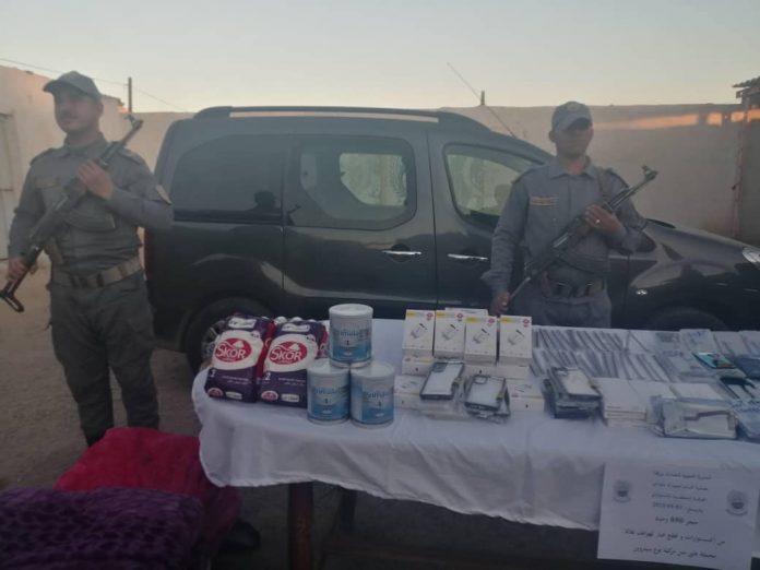 وحسب ما جاء في البيان ذاته، فإن أعوان الفرقة المتنقلة للجمارك التابعة لمصالح مفتشية الأقسام للجمارك بالوادي، على إثر عملية مراقبة ميدانية مشتركة مع أفراد الجيش الوطني الشعبي، تمكنت من حجز880 وحدة من أجزاء ولواحق الهواتف النقالة، تم ضبطها مخبأة بإحكام ضمن أجزاء وتجاويف سيارة سياحية تحمل ترقيما أجنبيا، مع حيازة بضائع أخرى استعملت في إخفاء الغش، منها ما يصنف ضمن المواد الاستهلاكية المدعمة.