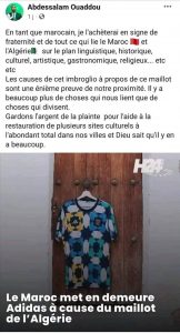 ليختتم وادو حديثه قائلا :”دعونا نوفر أموال الشكوى المسخرة ضد اديداس والجزائر في المساعدة في ترميم العديد من المدارس والمراكز الثقافية لإزالة الغبن عن أبناء وطننا”.