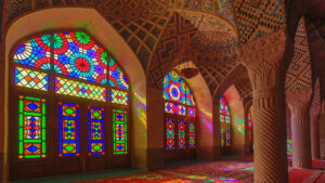 بشكل غير مألوف في المساجد، تضيء النوافذ الزجاجية الملونة في المسجد الإيراني في شيراز سجادته الفارسية.