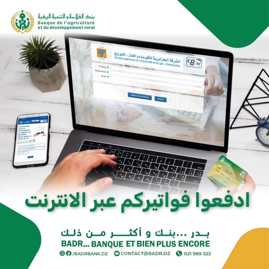 بنك “بدر” تطلق خدمة جديدة لتسديد الفواتير عبر الانترنت 14 ديسمبر، 2025 0 161 FacebookTwitterPinterestWhatsApp أفاد بنك الفلاحة والتنمية الريفية، “بدر”، أن يمكن للزبائن دفع مستحقات مختلف الفواتير الغاز، الماء، الكهرباء وغيرها عبر الأنترنت. وهذا عن طريق استخدام البطاقة البنكية “بدر” BADR، حيث تتيح الخدمة توفير الوقت وتفادي عناء التنقل. وأشار البنك إلى أن الخدمة سريعة، وآمنة ومتاحة 24 ساعة على 24 ساعة طيلة أيام الأسبوع. ولطلب بطاقةCIB BADR ، يمكن التوجه إلى أقرب وكالة BADR أو التواصل عبر: http://badrbank.dz