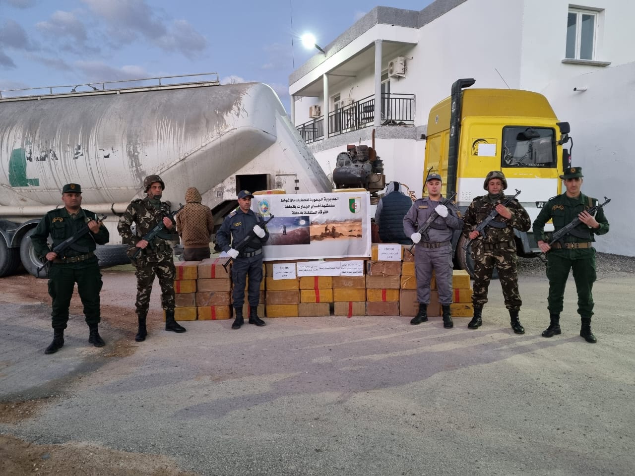 تمكن أعوان كل من الفرقة المتنقلة للجمارك بالجلفة والفرقة المتعددة المهام بقطارة بالتنسيق مع افراد الجيش الوطني وافراد الفرقة الاقليمية للدرك الوطني بمسعد، من تحقيق عملية نوعية تمثلت في حجز كمية معتبرة من الاقراص المهلوسة نوع بريغبالين 300 ملغ، قدرت هاته الكمية بــ 723300قرص مهلوس، كانت مخبأة على متن شاحنة بمقطورة. حيث تم توقيف متهمين (02) وتقديمهم امام الجهات القضائية المختصة.