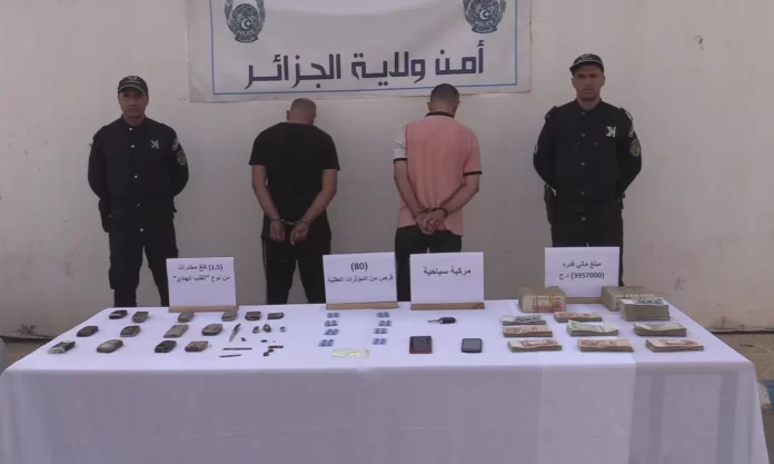 وأوضح البيان أن مصالح أمن ولاية الجزائر, ممثلة في فرقة الشرطة القضائية لأمن المقاطعة الإدارية بئر مراد رايس, تمكنت من معالجة قضية تكوين جمعية أشرار الحيازة المتاجرة نقل وتوزيع المخدرات ضمن شبكة إجرامية منظمة بإستعمال مركبة ذات محرك مع حيازة أسلحة بيضاء محظورة دون مبرر شرعي وفي هذا الإطار -يضيف المصدر ذاته- تم توقيف شخصين مشتبه فيهما تتراوح أعمارهما ما بين 52 و 59 سنة مسبوقين قضائيا ينحدران من ولاية الجزائر, مع حجز كيلوغرام ونصف من المخدرات من نوع القنب الهندي وثمانين قرصا من المؤثرات العقلية علاوة على مبلغ مالي يقدر ب 395 مليون و 700 ألف سنتيم جزائري من عائدات الترويج وخمسة أسلحة بيضاء محظورة وهاتفين نقالين ومركبة وبعد استكمال الإجراءات القانونية تم تقديم المشتبه فيهما أمام الجهات النيابية المختصة إقليميا, وفقا لنفس البيان.