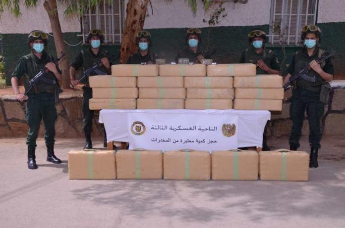 وفي إطار عمليات محاربة الجريمة المنظمة ومواصلة للجهود الحثيثة الهادفة إلى التصدي لآفة الاتجار بالمخدرات ببلادنا، أوقفت مفارز مشتركة للجيش الوطني الشعبي، بالتنسيق مع مختلف مصالح الأمن، بإقليمي الناحيتين العسكريتين الثانية والثالثة، بحسب الحصيلة الأسبوعية، 14 تاجر مخدرات منهم 3 من جنسية مغربية وأحبطت محاولات إدخال كميات ضخمة من المخدرات عبر الحدود مع المغرب، تُقدر بـ 11 قنطار و13 كيلوغرام من الكيف المعالج، في حين تم توقيف 42 تاجر مخدرات آخرين وضبط 164 كيلوغرام من نفس المادة و260074 قرصا مهلوسا خلال عمليات مختلفة عبر النواحي العسكرية الأخرى.