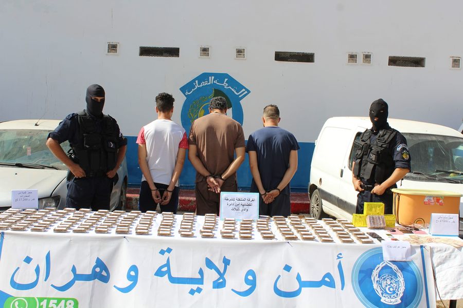حسب ما أفاد به بيان لشرطة وهران، تمكنت ذات العناصر من توقيف 03 أشخاص يمتهنون المتاجرة بالمخدرات، تتراوح أعمارهم ما بين 39 و42 سنة.